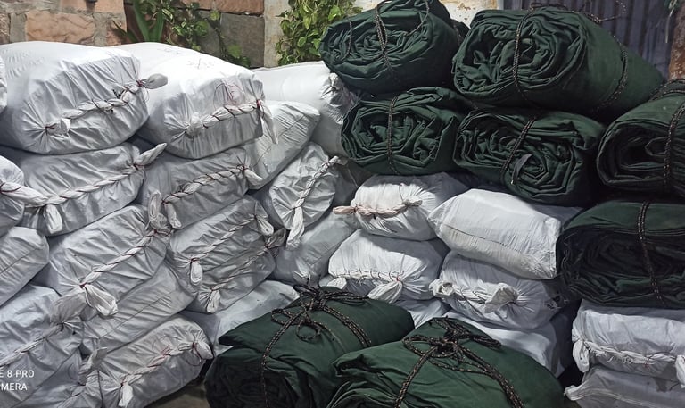 Waterproof, rot-proof cotton tarpaulins in olive green, made to IS specs.